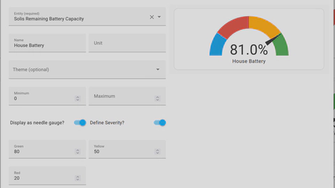 I have three gauges in Home Assistant that show the amount of power being generated by the solar panels, the state of charge of the batteries and the load on the batteries. They’re just basic needle gauges with some colours.